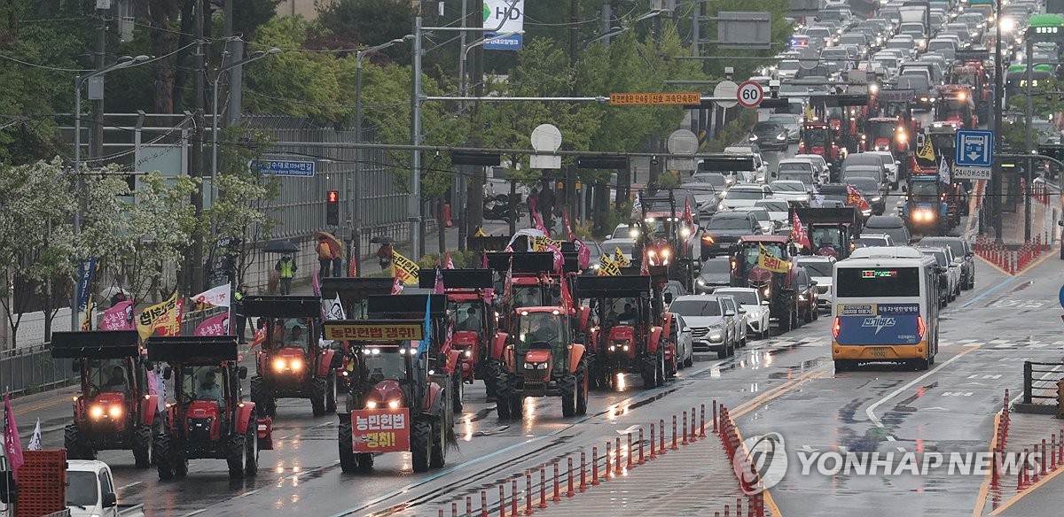 빗속에서 3개 차로를 이용해 저속 주행하던 트랙터 행렬은 12시 20분께 금천구 시흥대로 인근에서 '집회 제한 통고'를 내린 경찰 저지에 멈췄다. 트랙터 행렬 앞에 경찰차 한 대가 세워져 진로를 막았다.