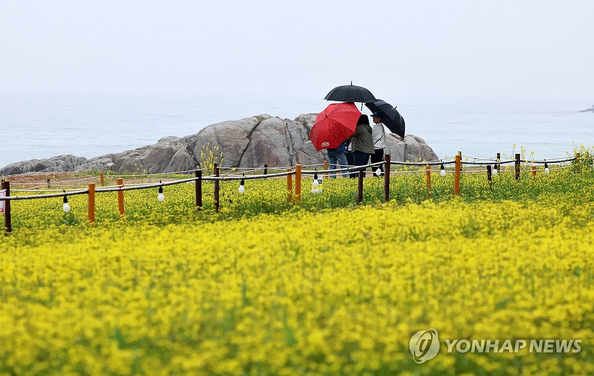 (강릉=연합뉴스) 유형재 기자 = 봄비가 내린 9일 노란 유채꽃이 피기 시작한 강원 강릉시 사근진 바닷가에서 관광객들이 추억을 쌓고 있다. 2025.5.9 yoo21@yna.co.kr