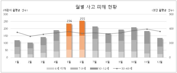 5월 어린이 교통사고 평균 건수는 236건, 6월은 255건이었다.
