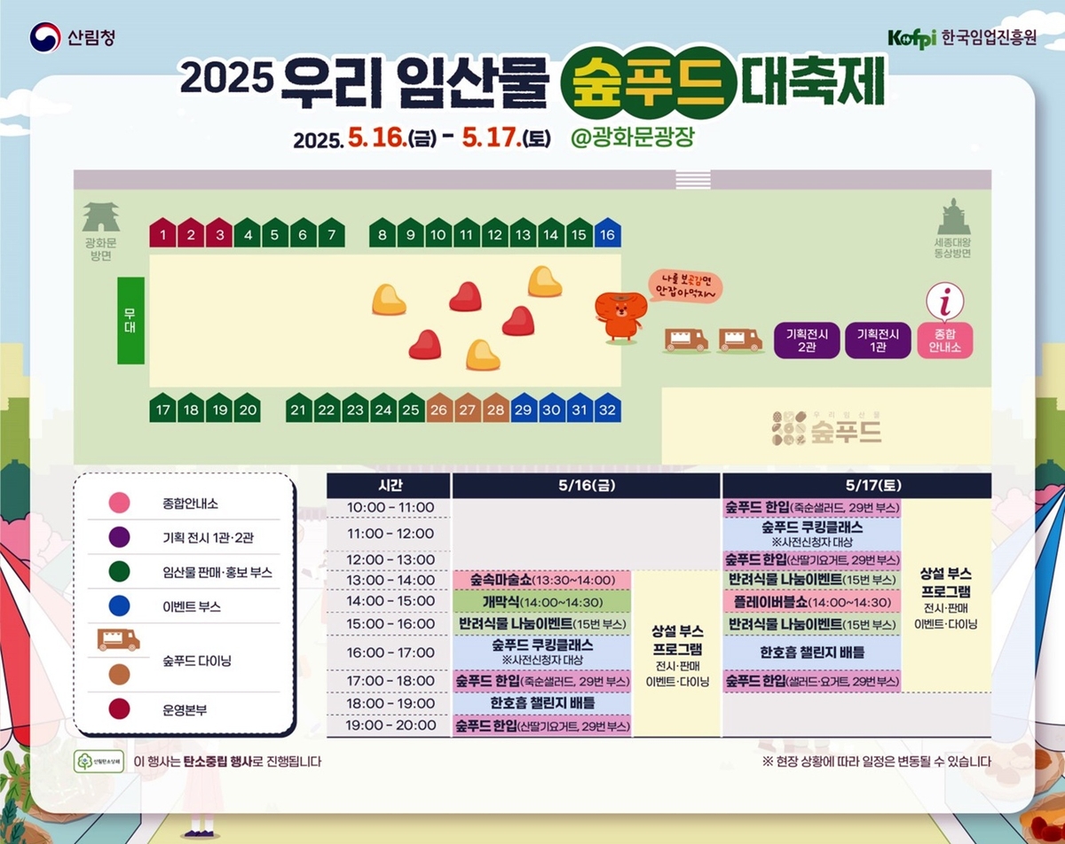 (대전=연합뉴스) 이은파 기자 = 산림청과 한국임업진흥원은 16∼17일 서울 광화문광장 육조마당에서 '2025년 우리 임산물 숲푸드 대축제'를 개최한다고 15일 밝혔다.
