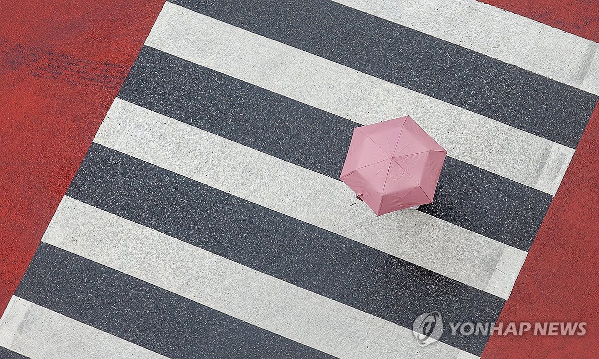 (서울=연합뉴스) 김도훈 기자 = 16일 비가 내린 서울 시내의 한 쇼핑몰 건물 앞으로 우산을 쓴 시민이 횡단보도를 지나고 있다. 2025.5.16 superdoo82@yna.co.kr
