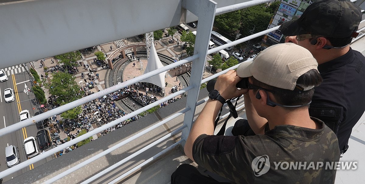 (거제=연합뉴스) 황광모 기자 = 14일 경남 거제시에서 열린 더불어민주당 이재명 대선후보 유세에서 경호에 나선 경찰이 특수 쌍안경을 이용해 주변 건물의 움직임을 살피고 있다. 2025.5.14 hkmpooh@yna.co.kr