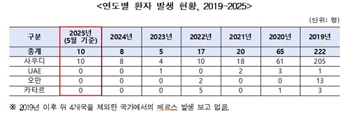 질병청에 따르면 사우디를 포함한 중동 지역에서는 메르스가 계속 발생하고 있다. 2019년 이후 메르스 환자는 사우디·아랍에미리트(UAE)·오만·카타르에서 보고됐으며 사우디 환자가 대부분이었다.