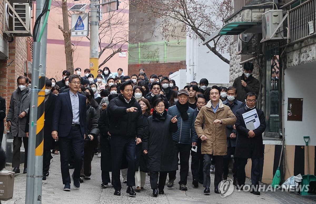 (서울=연합뉴스) 류효림 기자 = 오세훈 서울시장이 20일 오전 서울 강북구 미아3동 130번지 일대 신속통합기획 재개발 후보지를 찾아 노후 건축물을 살펴보고 있다. 2025.1.20 ryousanta@yna.co.kr
