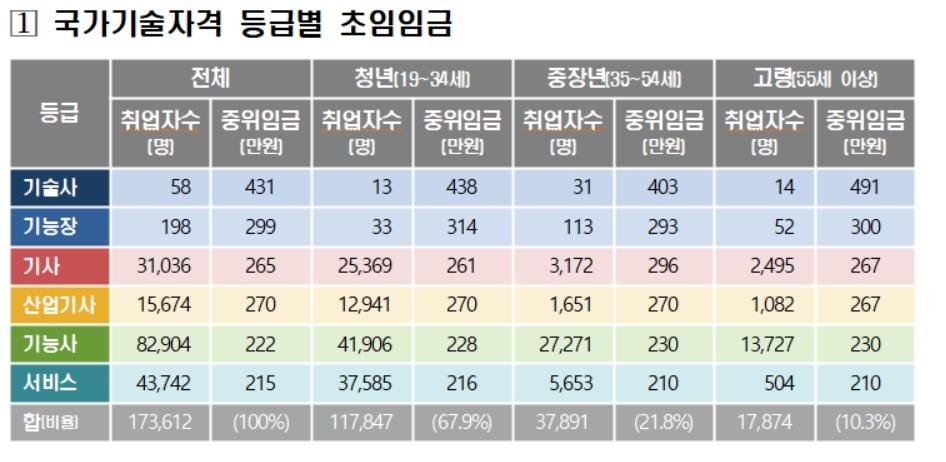 자격 취득자가 실제 받은 초임 중위임금은 등급별로 보면 가장 높은 등급인 기술사가 월 431만원으로 가장 높았다. 이어 기능장(299만원), 산업기사(270만원), 기사(265만원), 기능사(222만원), 서비스 등급(215만원) 순으로 조사됐다.