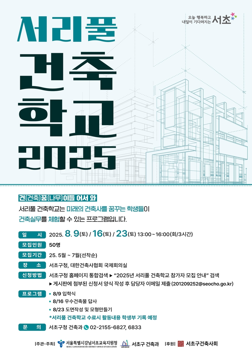 (서울=연합뉴스) 정준영 기자 = 서울 서초구(구청장 전성수)는 '서리풀 건축학교'에 참가할 학생을 모집한다고 30일 밝혔다.