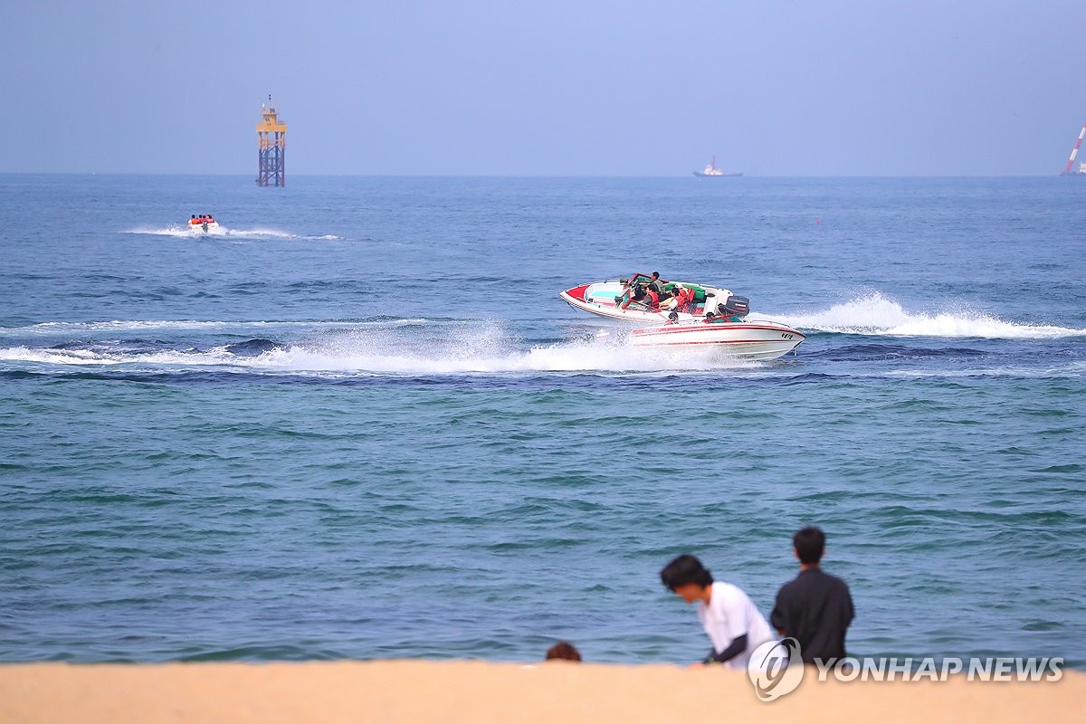(속초=연합뉴스) 류호준 기자 = 전국적으로 초여름 날씨를 보인 27일 오후 강원 속초 해수욕장에서 모터보트가 시원하게 바다를 가르며 질주하고 있다. 2025.5.27 ryu@yna.co.kr