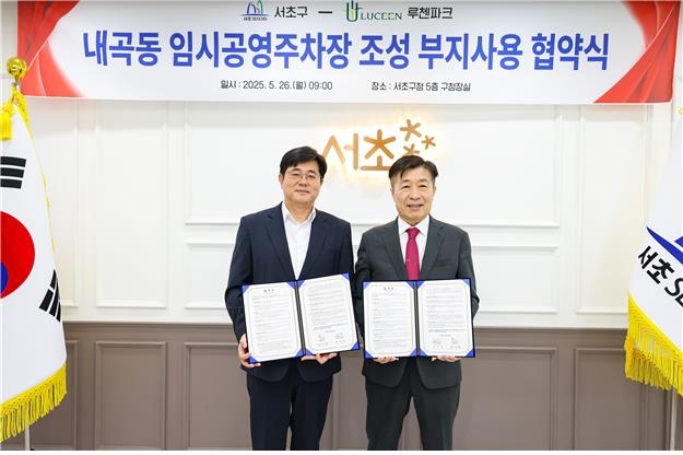 (서울=연합뉴스) 전성수 서울 서초구청장(오른쪽)과 박영철 ㈜루첸파크 대표이사가 지난달 26일 서초구청장실에서 내곡동 임시 공영주차장 조성 부지사용 협약 체결 후 기념 촬영하는 모습. 2025.6.1 [서초구 제공. 재판매 및 DB 금지]