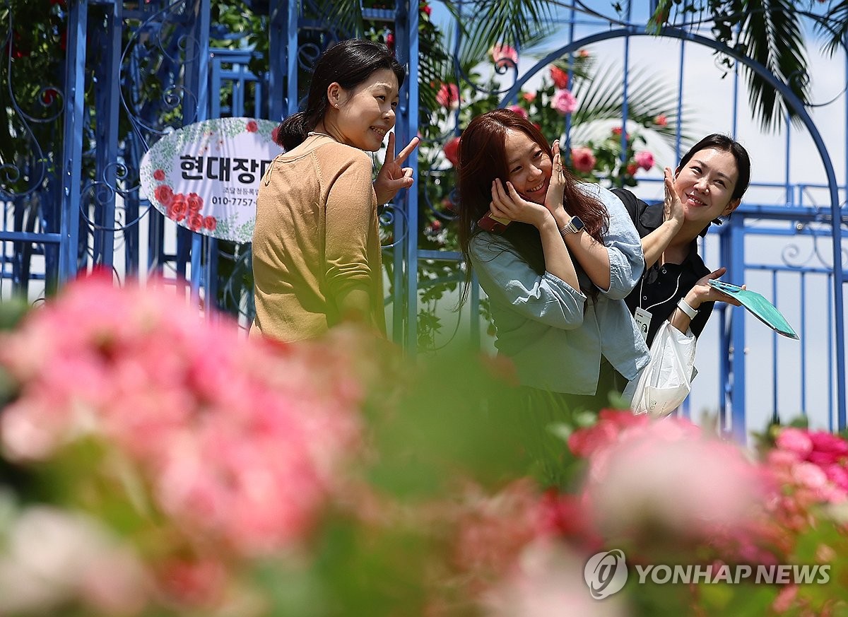 (서울=연합뉴스) 김도훈 기자 = 22일 서울 동작구 보라매공원에서 열린 2025 서울국제정원박람회를 찾은 시민들이 장미 정원에서 기념촬영을 하고 있다.