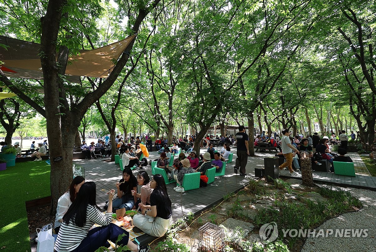 (서울=연합뉴스) 김도훈 기자 = 22일 서울 동작구 보라매공원에서 열린 2025 서울국제정원박람회를 찾은 시민들이 점심시간을 맞아 산책과 나들이를 즐기고 있다.