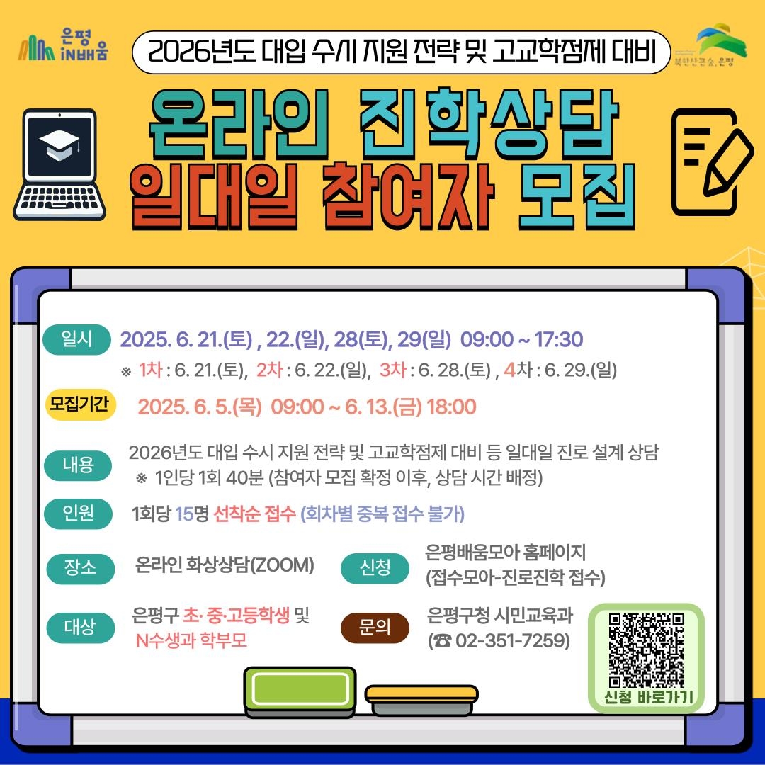 온라인 상담 신청은 은평배움모아 누리집을 통해 오는 5일부터 13일까지 선착순으로 받는다. 신청 인원은 회차당 15~24명이다.