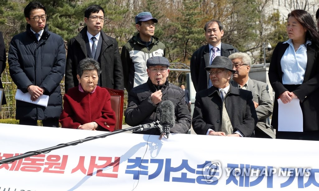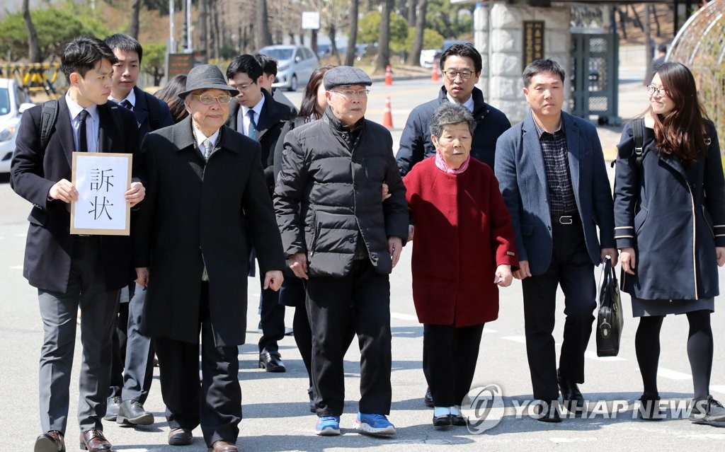 (서울=연합뉴스) 최재구 기자 = 4일 서울 서초구 법원삼거리에서 일제강제동원 사건 추가소송 제기 기자회견을 마친 강제동원 피해자 김한수, 김용화 할아버지가 민주사회를 위한 변호사모임 관계자들과 함께 소장을 접수하기위해 법원으로 향하고 있다. 2019.4.4 jjaeck9@yna.co.kr