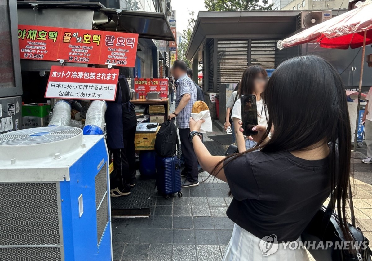 줄 서 있는 사람들 사이로 일본, 미국 등 다양한 국적의 외국인 관광객도 눈에 띄었다. 호떡을 받아든 손님들은 노점을 배경으로 인증샷을 남기기도 했다.