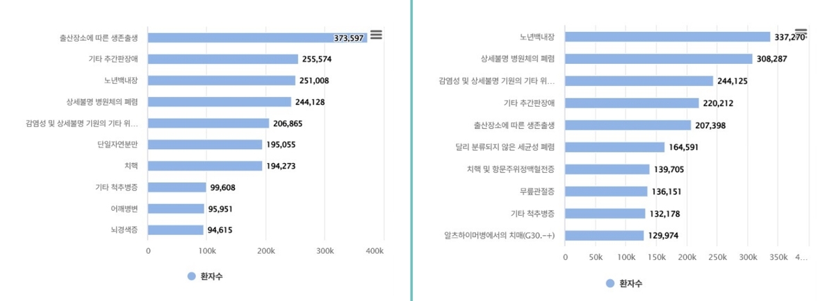 10년 전인 2014년엔 신생아에게 부여되는 상병(傷病) 명칭인 '출산장소에 따른 생존출생'(37만3천597명)이 입원 다빈도 상병 1위였다.