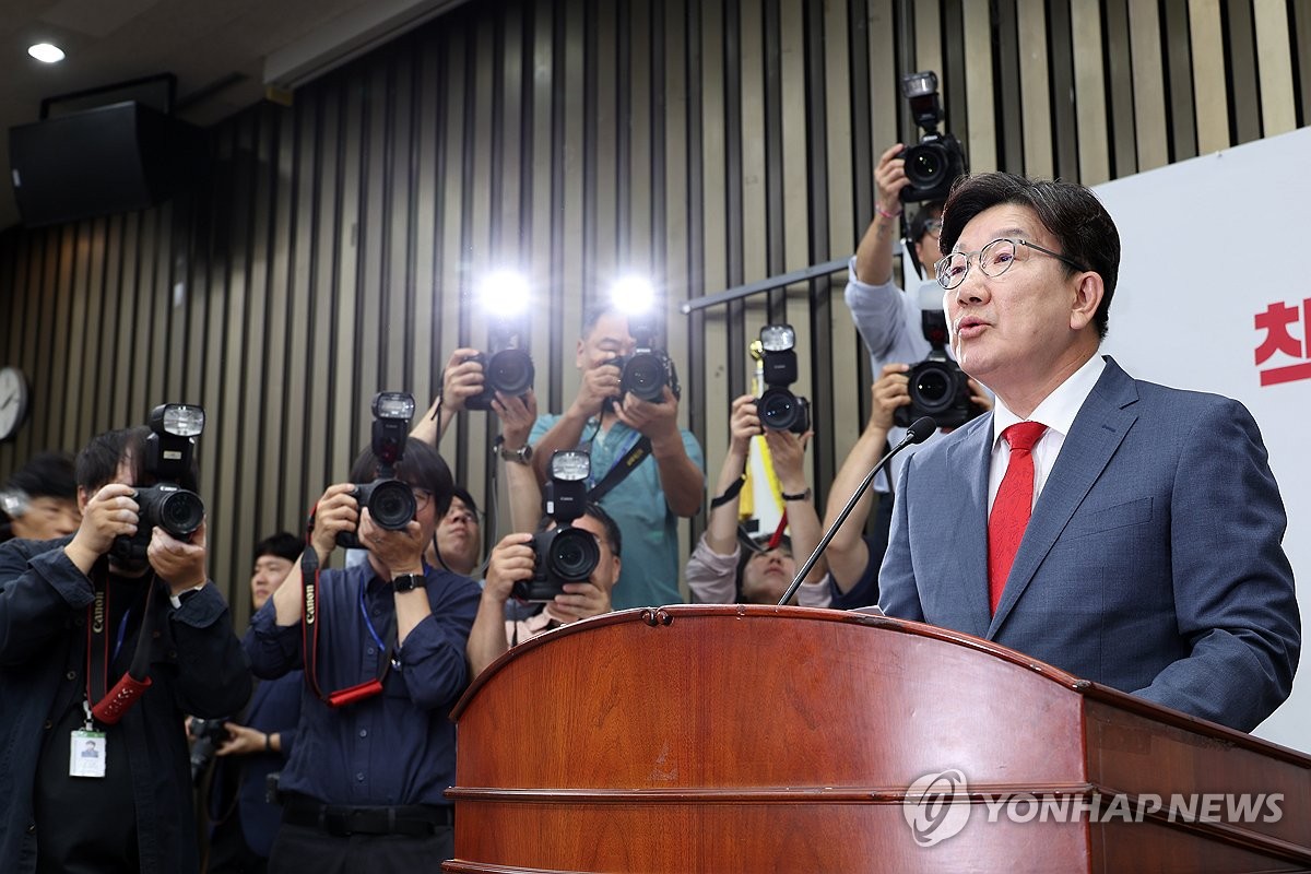 (서울=연합뉴스) 박동주 기자 = 원내대표직 사퇴를 선언한 국민의힘 권성동 원내대표가 9일 서울 여의도 국회에서 열린 의원총회에서 발언하고 있다. 2025.6.9 pdj6635@yna.co.kr