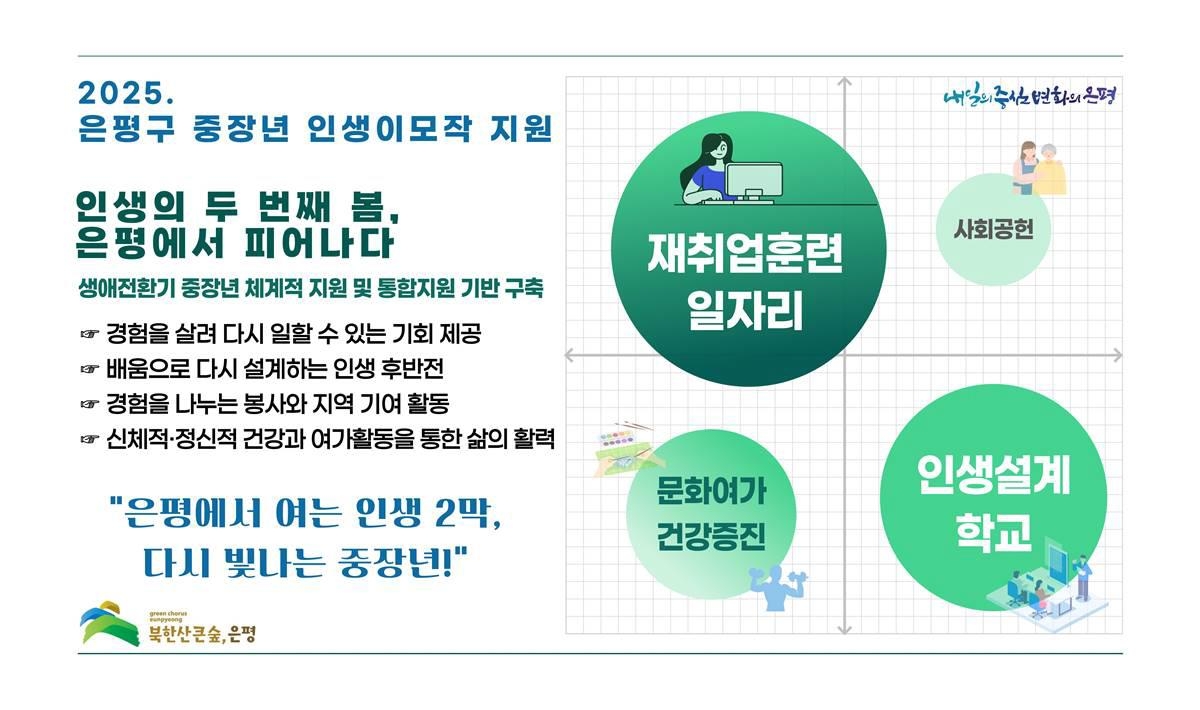 '인생의 두 번째 봄, 은평에서 피어나다'를 표어로, 퇴직 전후의 중장년층이 삶을 재설계하고 지역사회와 연결된 건강하고 의미 있는 삶을 살아갈 수 있도록 하는 다양한 지원책이 담겨 있다.