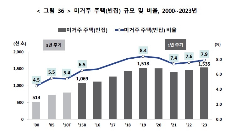2023년 기준 통계청 조사의 빈집은 전년 대비로 5.7%로 증가했다. 전체 주택 가운데 빈집의 비율은 7.9%로, 전년 대비 0.3%포인트(p) 늘었다.