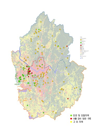 이 지도를 보면 수도권 너구리 226개체를 분석한 결과 '인천과 서울 서부 및 경기 남서부 등 그 인접지', '서울 강서·양천·구로', '나머지 경기 북부' 등 3개 지역에 분리된 개체군을 형성하고 있다.