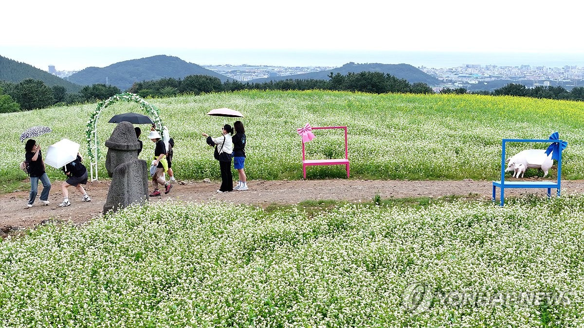 (제주=연합뉴스) 박지호 기자 = 비가 내리기 시작한 21일 오전 제주시 오라이동 중산간의 메밀밭을 찾은 관광객이 활짝 핀 메밀꽃을 즐기고 있다. 2025.5.21 jihopark@yna.co.kr