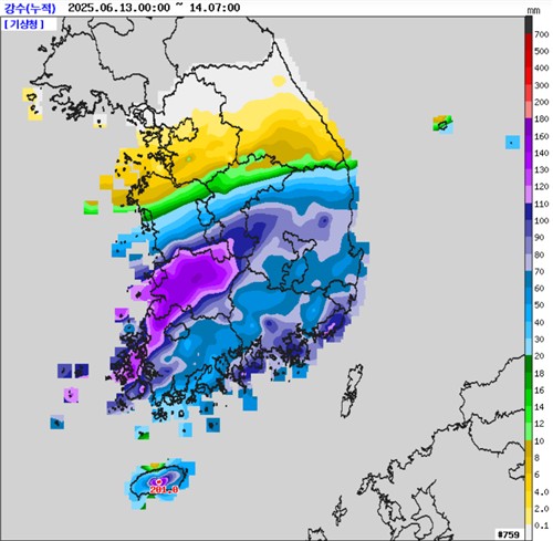 전날부터 이날 오전 7시까지 누적 강수량은 제주 한라산(진달래밭) 201.0㎜, 전북 전주(완산구) 165.5㎜, 전남 장성(삼서면) 163.5㎜, 전북 정읍과 고창 156.6㎜와 150.0㎜, 부산 126.6㎜, 경남 거제와 통영 110.9㎜와 103.6㎜ 등이다.