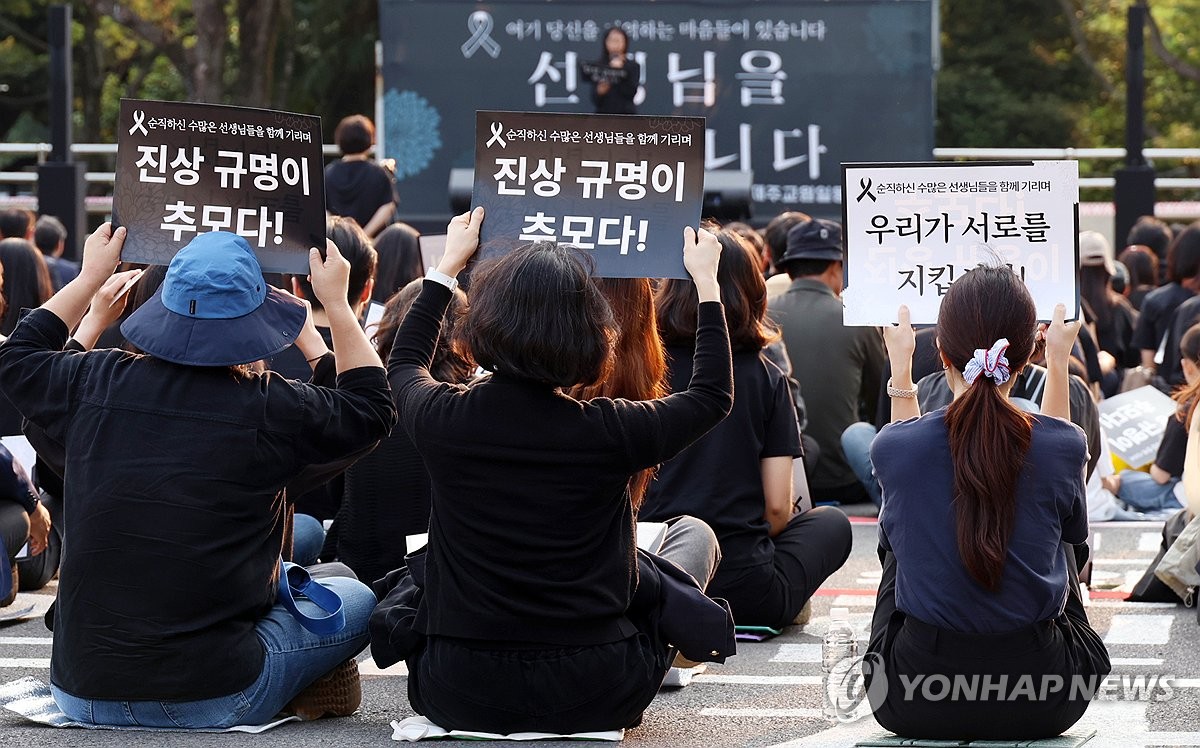 한국교원단체총연합회, 교사노동조합연맹, 전국교직원노동조합 등 92개 교원 단체 및 노동조합은 14일 오후 정부서울청사 앞에서 '제주 교사 추모 및 교권 보호 대책 요구 전국 교원 집회'를 열었다.