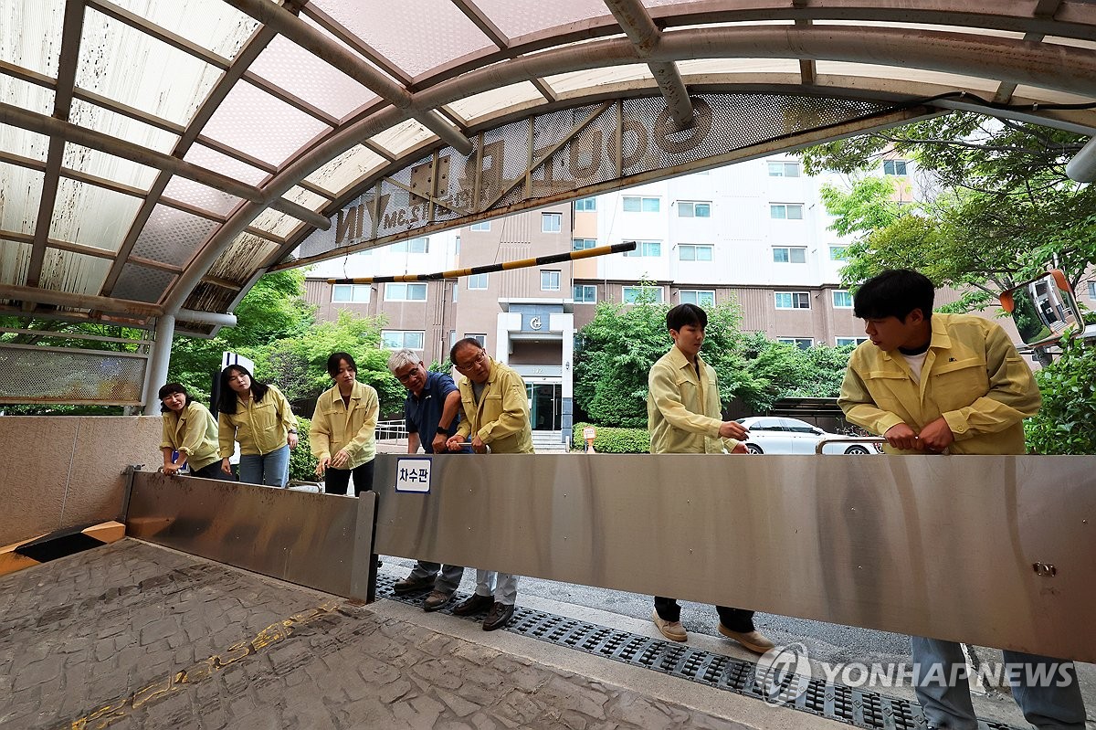 (광주=연합뉴스) 조남수 기자 = 13일 오전 광주 북구 용봉동 한 아파트 지하주차장 입구에서 북구청과 행정복지센터 직원들이 장마대비 차수막 설치 점검하고 있다. 2025.6.13 iso64@yna.co.kr