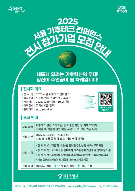 참여하려는 기업은 이달 16일부터 내달 31일까지 '2025 서울 기후테크 컨퍼런스' 공식 홈페이지(https://sctc.seoul.kr)에서 신청하면 된다.