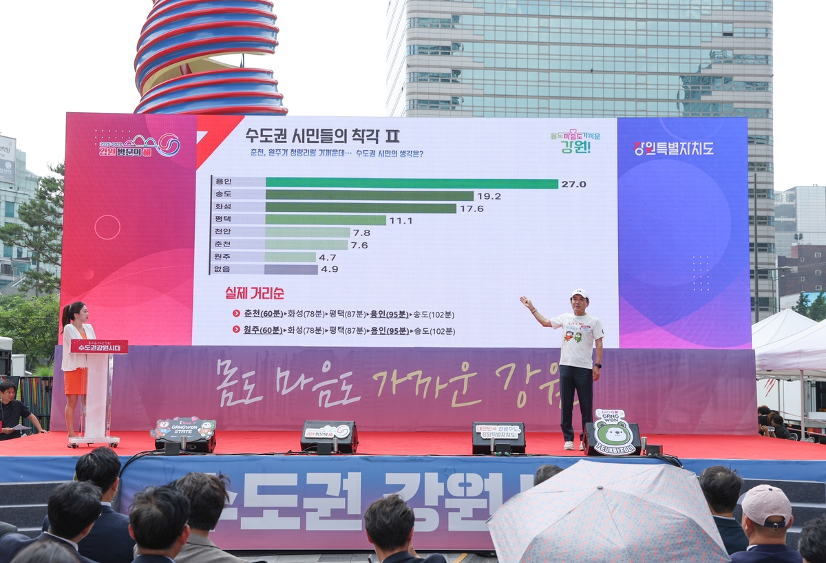 (춘천=연합뉴스) 이재현 기자 = 강원특별자치도가 '몸도 마음도 가까운 강원도! 수도권 시대' 선포식을 통해 '막연히 멀다'는 심리적 거리감 해소에 나섰다.