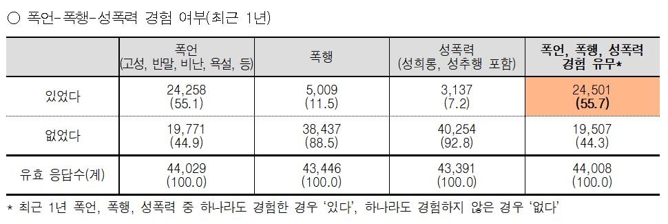 성별로는 여성의 폭언·폭행·성폭력 경험률이 각각 59.8%·12.7%·8.4%로, 남성 2∼3배 수준이었다. 남성의 폭언·폭행·성폭력 경험률은 각각 36.0%·6.9%·2.5%였다.