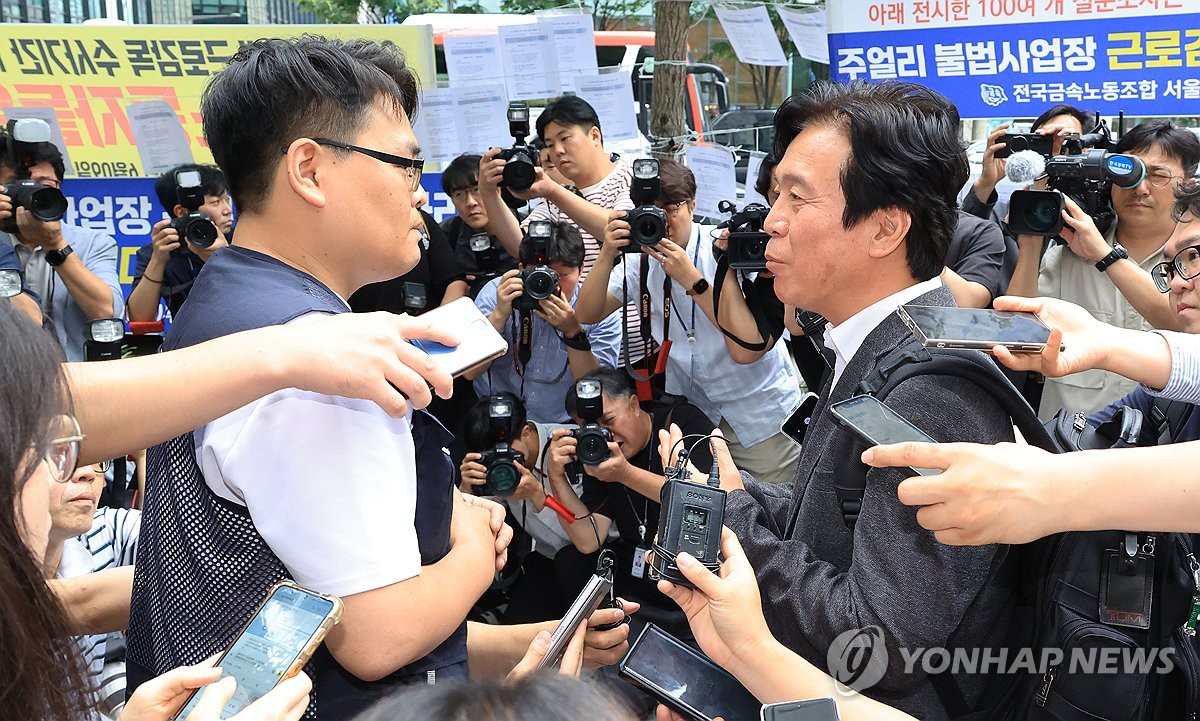 (서울=연합뉴스) 최재구 기자 = 김영훈 고용노동부 장관 후보자가 24일 인사청문회 준비 사무실이 위치한 서울 중구 서울지방고용노동청으로 들어가다 민주노총 금속노조 주얼리분회 조합원들의 요청에 대화 하고 있다. 2025.6.24 jjaeck9@yna.co.kr
