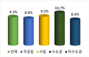 이 비율은 사립대학(9.5%)이 국·공립대학(8.8%)보다, 수도권대학(10.7%)이 비수도권대학(8.4%)보다 높았다.