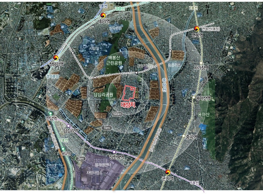 용도지역 상향(2종7층·3종→3종) 및 최고 36층 안팎의 유연한 스카이라인 계획을 통해 답십리공원∼장이소공원∼용마산으로 열린 통경축을 확보했다.