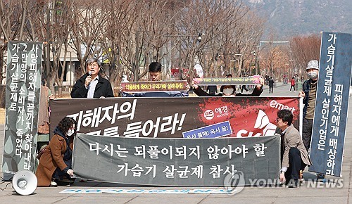 (서울=연합뉴스) 진연수 기자 = 환경보건시민센터, 서울환경연합 등 시민사회단체 회원들이 11일 서울 종로구 광화문 이순신 동상 앞에서 가습기 살균제 참사 관련 기자회견을 하고 있다. 2025.3.11 jin90@yna.co.kr