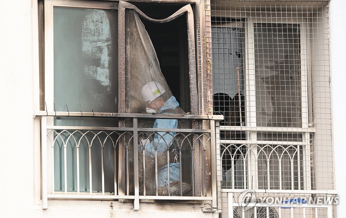 (부산=연합뉴스) 강선배 기자 = 어린이 2명이 숨진 부산 기장군의 한 아파트 6층 화재 현장에서 3일 오전 경찰, 소방, 국립과학수사연구원 등이 합동 감식을 벌이고 있다. 2025.7.3 sbkang@yna.co.kr
