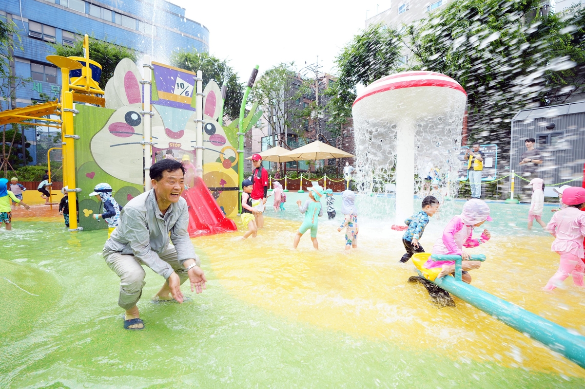 3일 개장한 꿈나라어린이공원. 물놀이형 놀이시설과 함께 데크쉼터, 샤워기, 간이 탈의실 등 부대시설을 갖추고 사계절 활용할 수 있는 공간으로 재정비했다. 이승로 성북구청장이 꿈나라어린이공원을 찾은 어린이들과 물놀이를 하고 있다.