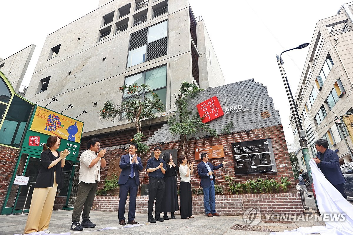 (서울=연합뉴스) 진연수 기자 = 4일 서울 종로구 아르코꿈밭극장에서 열린 재개관 기념행사에서 참석자들이 현판을 제막하고 있다.