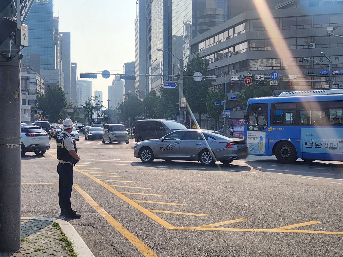 (서울=연합뉴스) 이율립 기자 = 8일 오전 8시 서울 동대문구 신설동역 오거리. 간밤 식지 않은 열기에 아침 햇볕이 더해지며 아스팔트는 말 그대로 끓는 듯했다. 그늘 하나 없는 도로 위에서 동대문경찰서 소속 심규범(30) 경장의 호루라기 소리는 멈출 새가 없었다. 출근길 끼어들기, 꼬리물기 등 얌체 운전 단속 등이 그의 임무다.
