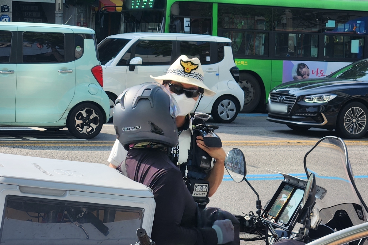 박 경장이 받은 아이스팩은 10분 만에 물이 뚝뚝 떨어졌다. 30분이면 완전히 녹는다고 했다. 더위로 쉽게 지치지만, 교통경찰에게는 시민의 도로 위 안전이 최우선이다. 박 경장은 "끼어드는 차들을 단속하고 난 뒤 가끔 뒤에 있던 차량이 창문을 내리고 엄지손가락을 들어줄 때가 있는데 그때 힘이 난다"고, 심 경장은 "고생한다는 시민들의 말씀 한마디에 보람을 느낀다"고 했다.