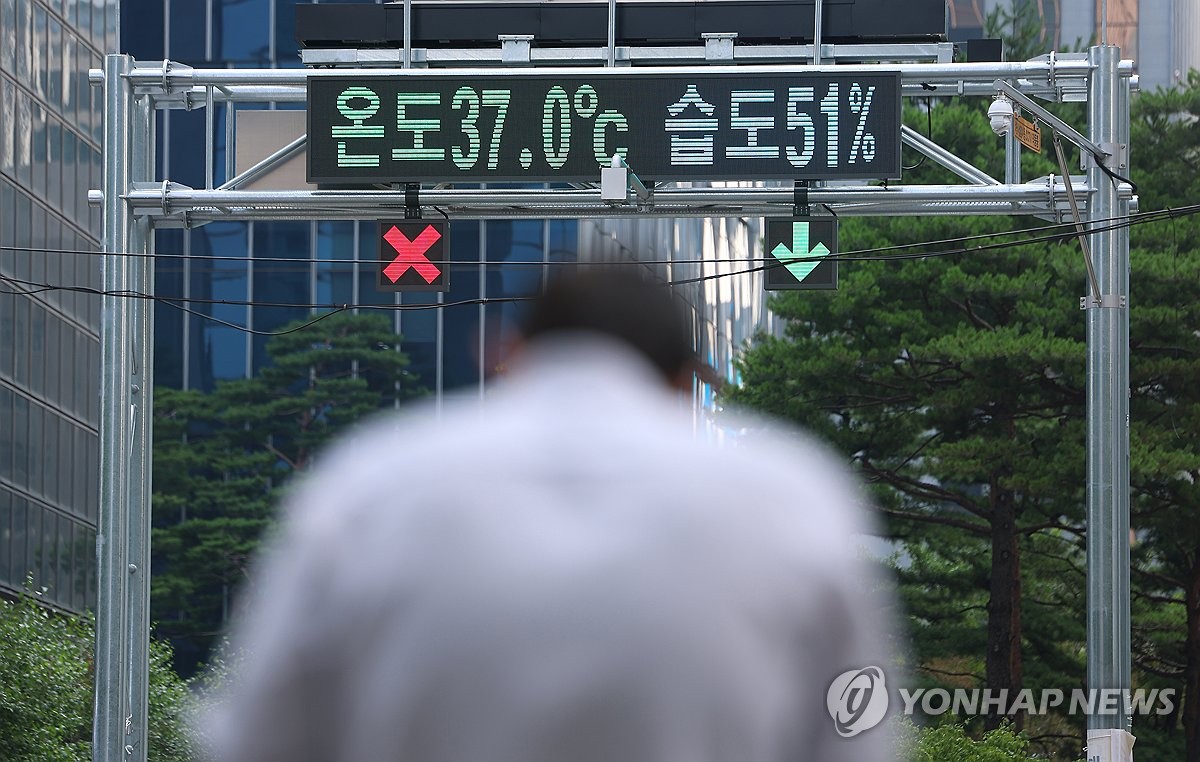 (서울=연합뉴스) 김도훈 기자 = 서울 기온이 근대적인 기상관측을 시작한 이래 7월 상순 기온으론 역대 최고치를 기록한 8일 서울 시내의 한 스크린에 '온도 37도'가 표시돼 있다. 2025.7.8 superdoo82@yna.co.kr