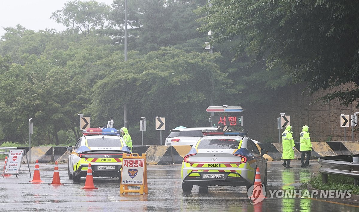 (서울=연합뉴스) 신현우 기자 = 수도권에 이틀째 집중호우가 쏟아진 18일 오후 서울 올림픽대로 양방향 여의상류IC를 경찰이 통제하고 있다. 2024.7.18 nowwego@yna.co.kr
