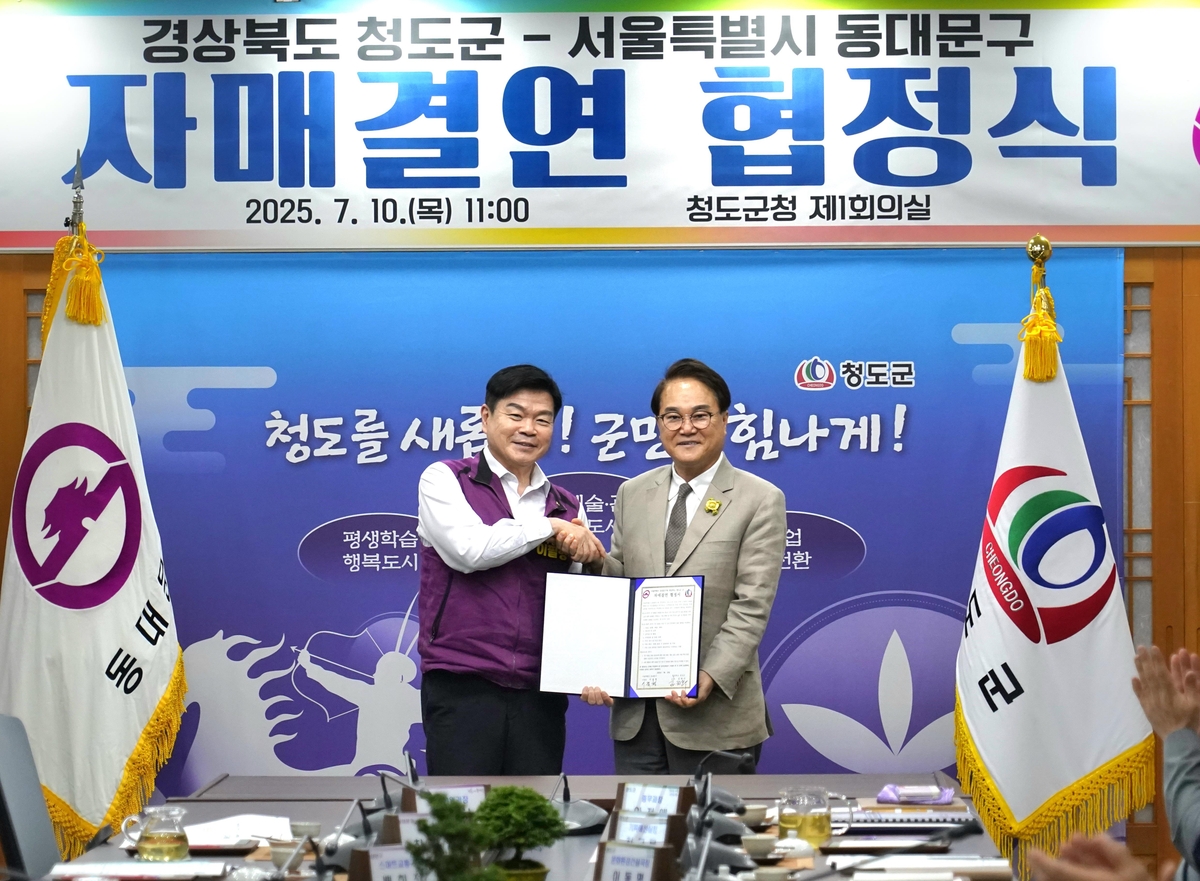 (서울=연합뉴스) 정준영 기자 = 서울 동대문구(구청장 이필형)와 경상북도 청도군(군수 김하수)은 10일 청도군청에서 자매결연 협정을 체결했다고 11일 밝혔다.