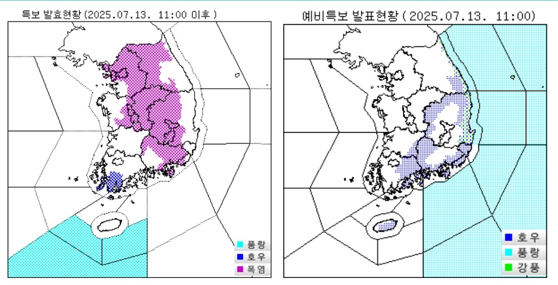 13일 오전 11시 이후 기상(예비)특보 발효(발표) 현황. [기상청 제공. 재판매 및 DB 금지]