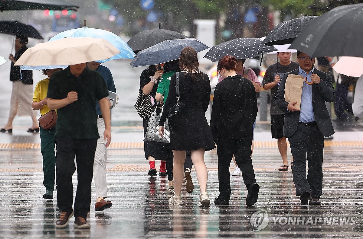 (서울=연합뉴스) 김성민 기자 = 비가 내린 14일 서울 종로구 광화문광장 인근에서 외국인 관광객이 비를 맞으며 이동하고 있다. 2025.7.14 ksm7976@yna.co.kr