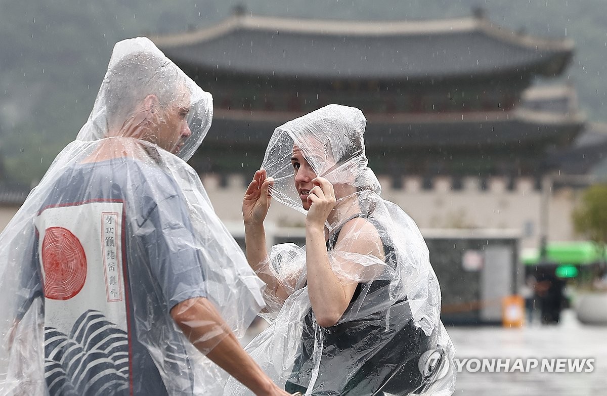(서울=연합뉴스) 김성민 기자 = 비가 내린 14일 서울 종로구 광화문광장 인근에서 외국인 관광객이 비를 맞으며 이동하고 있다. 2025.7.14 ksm7976@yna.co.kr