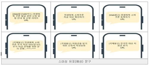 보안 공지에 따르면 '지원금, 대상자, 쿠폰 발급처' 등 키워드를 사용한 스팸 메시지를 보내 개인정보·금융정보를 탈취하려는 시도가 예상된다.