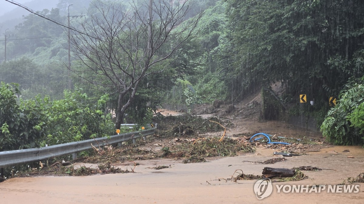 (산청=연합뉴스) 19일 폭우와 산사태가 발생한 경남 산청군 한 도로에 돌과 나무 등이 쌓여 있다. 2025.7.19 [독자 제공. 재판매 및 DB 금지] image@yna.co.kr