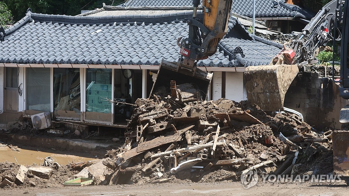 (산청=연합뉴스) 김동민 기자 = 22일 경남 산청군 산청읍 모고리에서 굴착기가 최근 집중호우로 침수된 주택의 수해복구 작업을 하고 있다. 2025.7.22 image@yna.co.kr