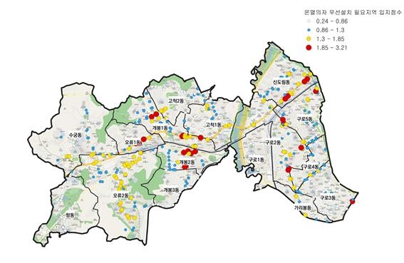 119곳의 우선 설치 필요지역 중에는 구로2동(21곳), 오류2동(19곳), 신도림동(18곳), 개봉1동(17곳) 등지에서 온열의자 설치 수요가 특히 높았다.