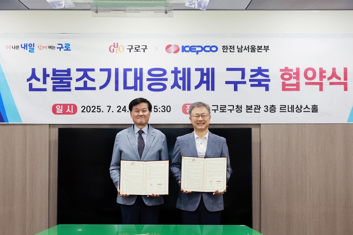 (서울=연합뉴스) 정준영 기자 = 구로구(구청장 장인홍)는 지난 24일 한국전력공사 남서울본부와 '산불 조기대응 체계 구축을 위한 업무협약'을 체결했다고 25일 밝혔다.