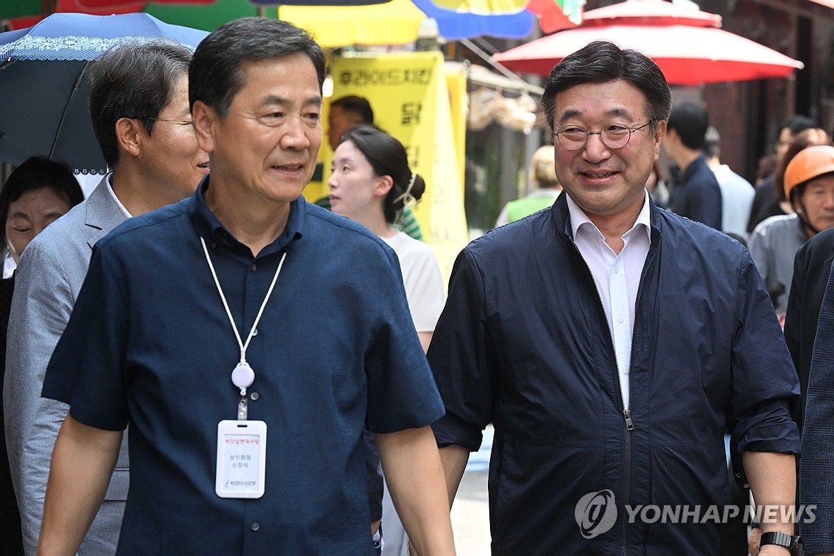 (서울=연합뉴스) 최재구 기자 = 윤호중 행정안전부 장관(오른쪽)이 24일 서울 금천구 비단길 현대시장을 찾아 민생회복 소비쿠폰 사용 방법을 설명하기 위해 매장으로 향하고 있다. 2025.7.24 [공동취재] jjaeck9@yna.co.kr